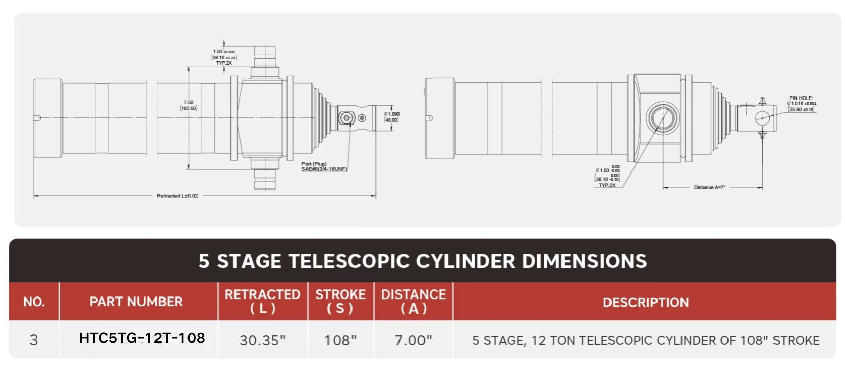 "HTC5TG-12T-108", 5 Kademeli, 12 Ton 108" Stroklu Teleskopik Silindir