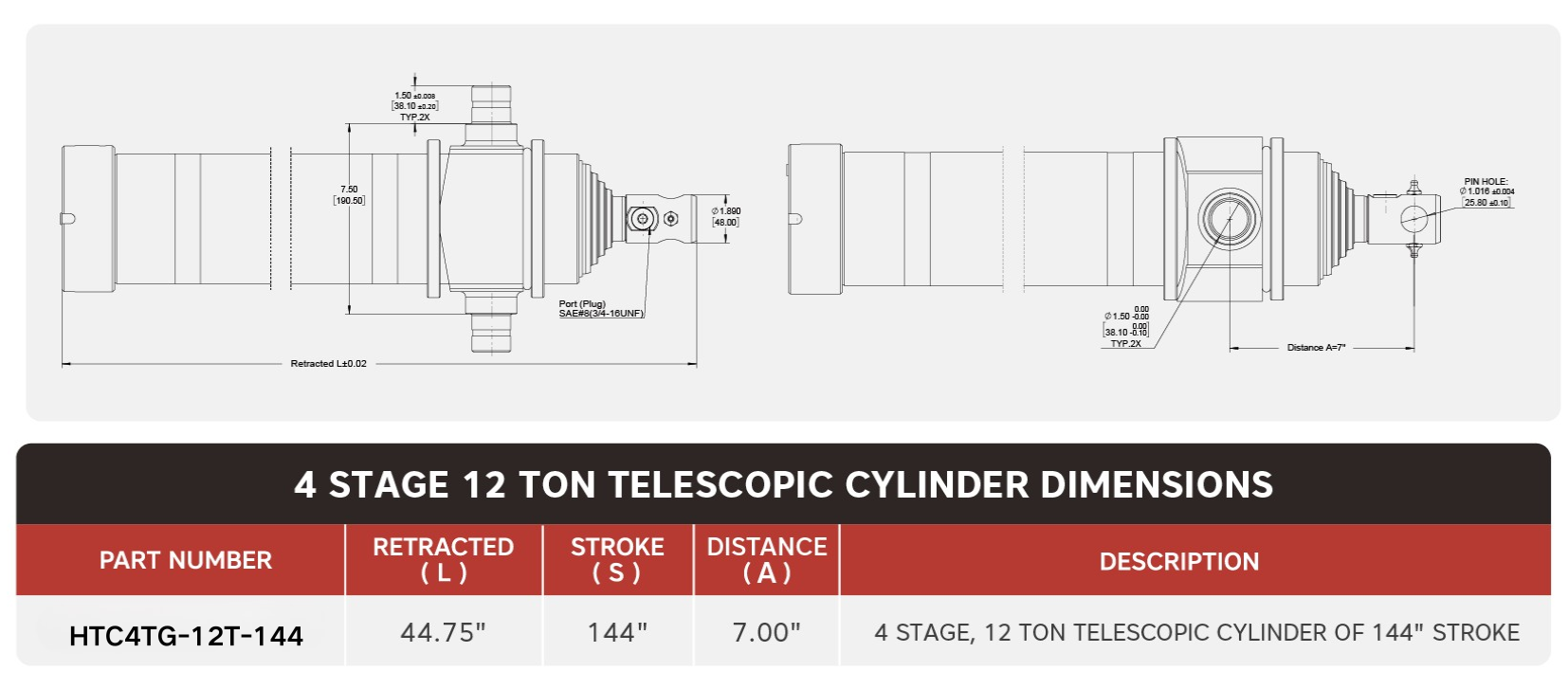 "HTC4TG-12T-144", 4 Kademeli, 12 Tonluk 144" Stroklu Teleskopik Silindir